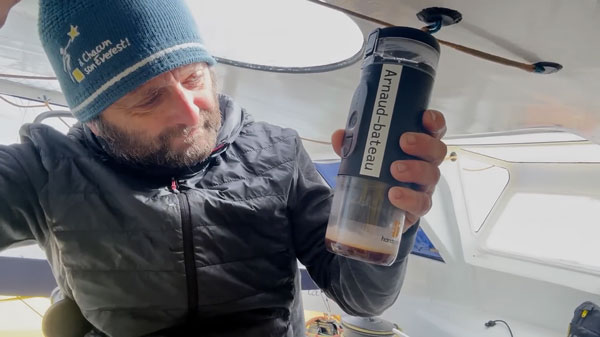 Sur cette même Transat Café l’Or, un autre skipper a embarqué avec sa machine Handpresso : Arnaud Boissières. Habitué lui aussi aux grandes traversées et au Vendée Globe, il navigue depuis plusieurs années avec sa Handpresso E-Presso.