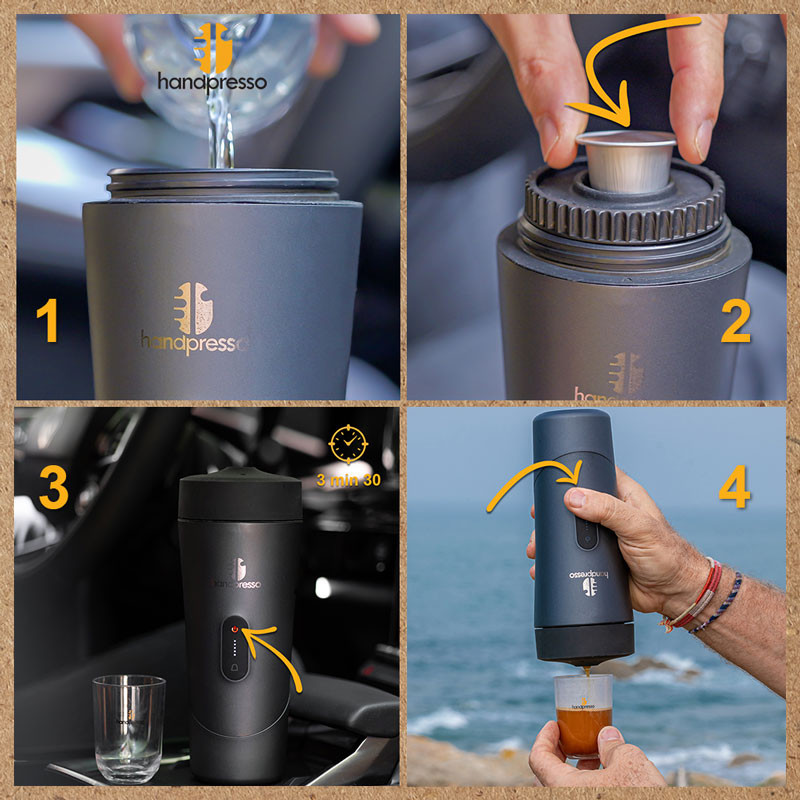 La nouvelle Handpresso Auto est la cafetière de voyage par excellence. Sans fil, son usage est intuitif et rapide. Que ce soit en voiture, en vacances, en plein air ou à la maison, elle vous garantit un expresso ou un lungo parfait.