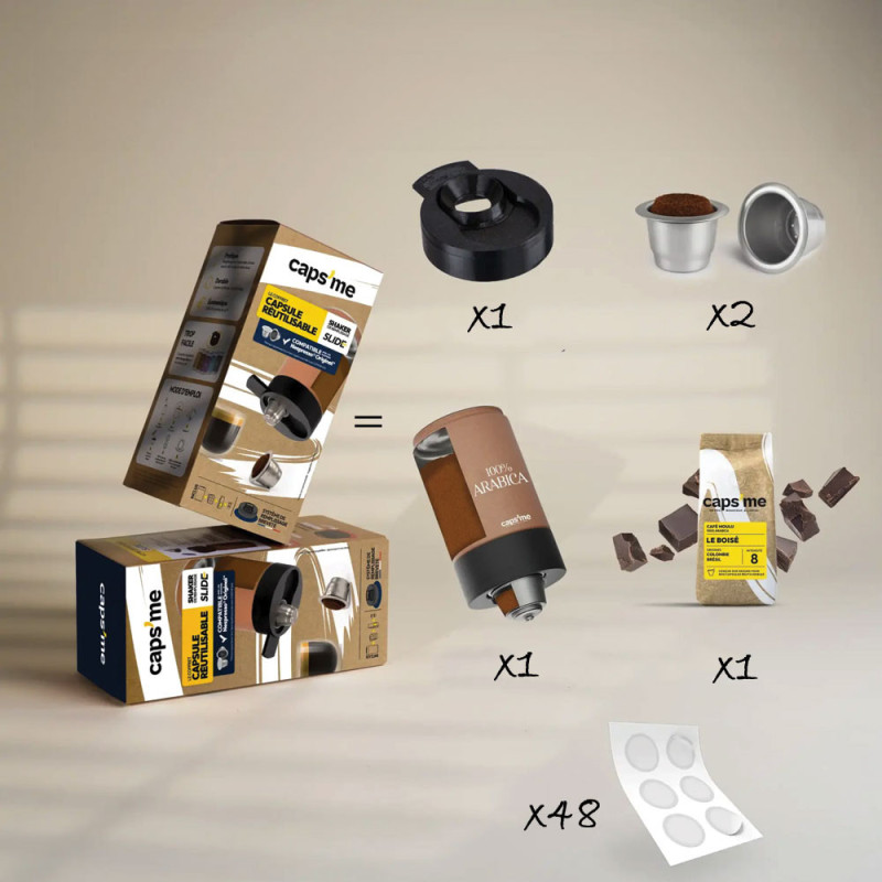Con il Coffret Slide, preparare capsule riutilizzabili in acciaio inox con il tuo caffè macinato preferito è un gioco da ragazzi: